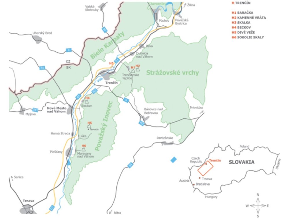 • Beckov - vápencové hradné bralo sa týči priamo nad domami v dedinke Beckov. Skala má atraktívny vzhľad s čiernymi stečenými pruhmi a ohromí vás aj výškou - zaleziete si aj vo viacdĺžkových cestách. Ľahké cesty sú často dosť vyšmýkané, no tie ťažšie ponúkajú dobré podmienky. Najťažsou cestou je Absolutórium 11 a väčšinou sú tu cesty strednej a vyššej obťažnosti.