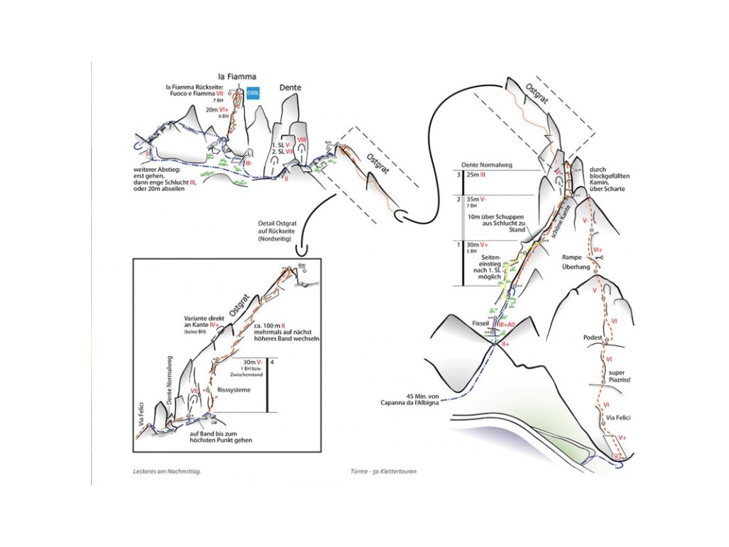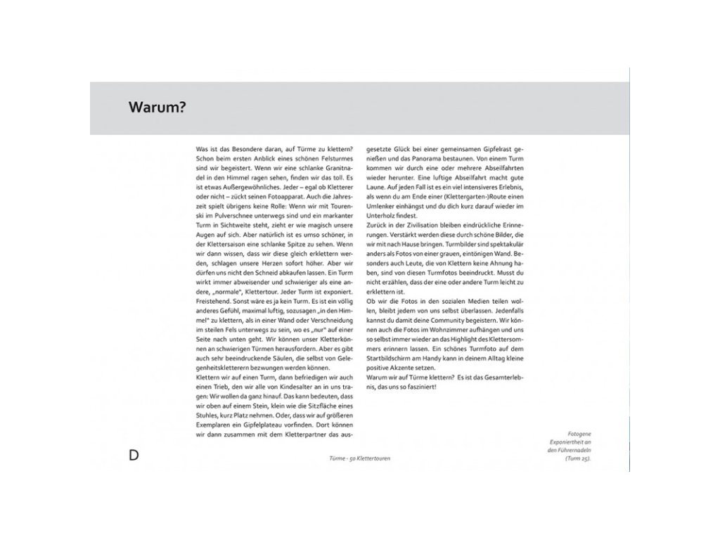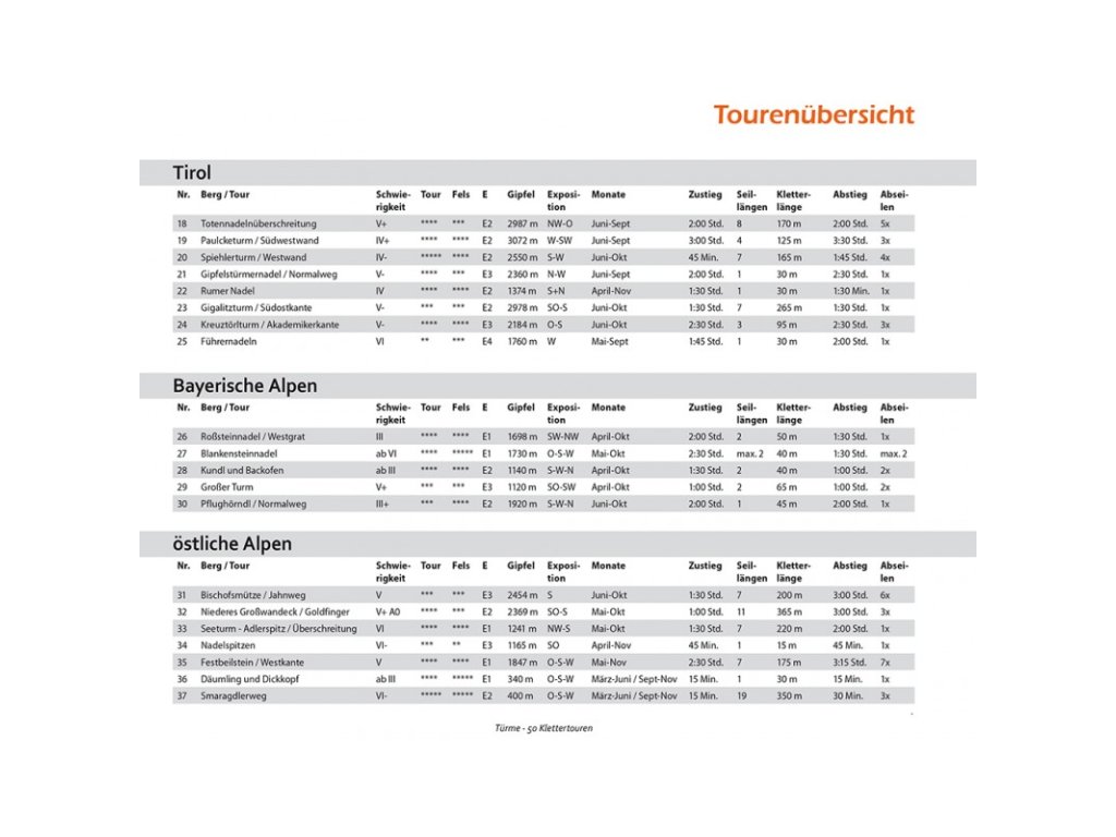 Výběr věží v v této knize jde od známých příkladů, jako je Schijenzan v Rätikonu, přes bláznivé jehlovité vrcholy v Höllengebirge až po rekreační cesty na Cinque Torri v Dolomitech.